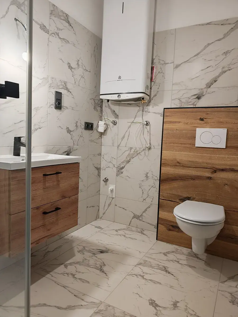 V bytě použity nadstandardní materiály: vinylová podlaha, obložkové interiérové dveře, koupelna s proskleným sprchovým koutem, designové baterie a doplňky, kuchyňská linka na míru s vestavnými spotřebiči, včetně myčky, prostorná terasa.