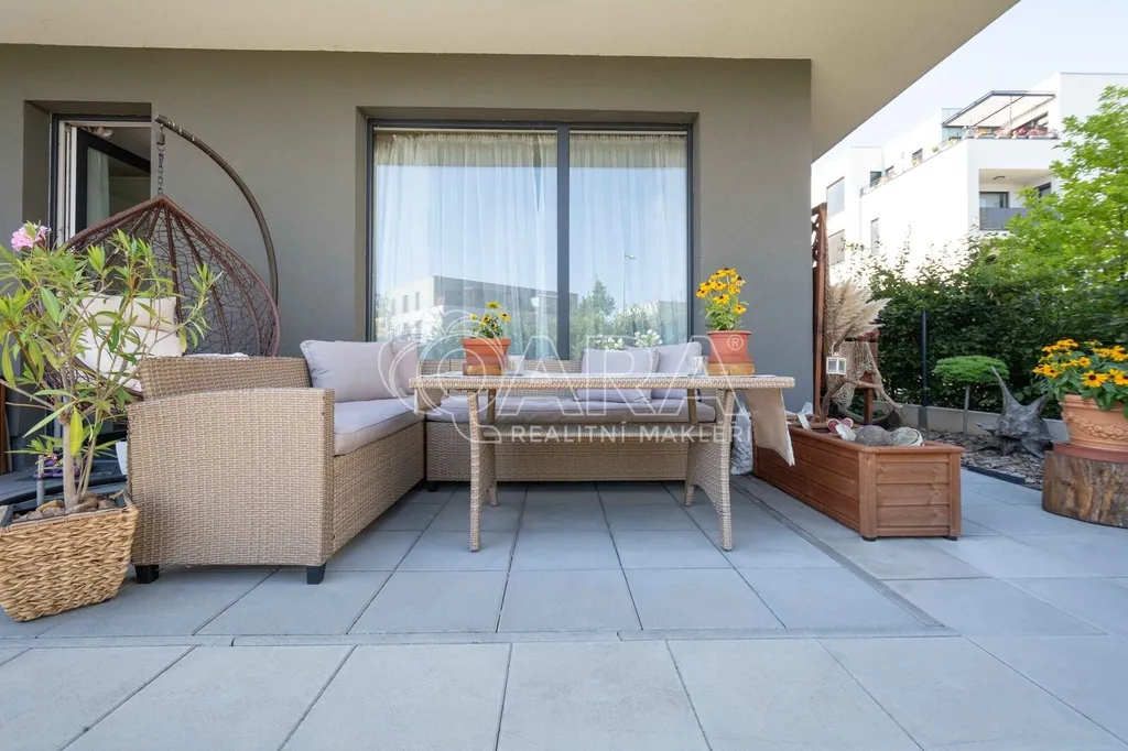 Dispozice bytu v přízemí zdařilé novostavby z roku 2021: vstupní chodba s vestavěnou skříní, ložnice, obývací pokoj s kuchyňským koutem a vstupem na terasu, koupelna s vanou a WC. Z vybavení na fotografiích zůstane jen část: kuchyňská linka včetně spotřebičů (indukční deska, el. trouba, vestavěná lednice s mrazákem, digestoř), dále zůstane šatní skříň v ložnici, gauč a sezení na terase.
