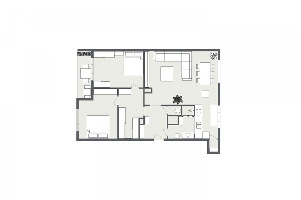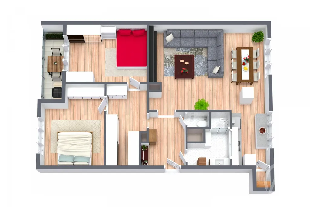 Dispozice je ideální, ať pro rodinu, pár, nebo někoho, kdo má rád prostor kolem sebe. Najdeš tu dva velké neprůchozí pokoje a k tomu velký obývák s kuchyní, kde se vejde ledacos včetně jídelního koutu. Super bonus je místo na šatnu konečně nebudeš lovit mikiny ze židle nebo z rohu ložnice. Když budeš chtít na chvíli vypnout, skočíš na balkon s kávou nebo sklenkou vína a svět zpomalí. S vínem teda stopro.