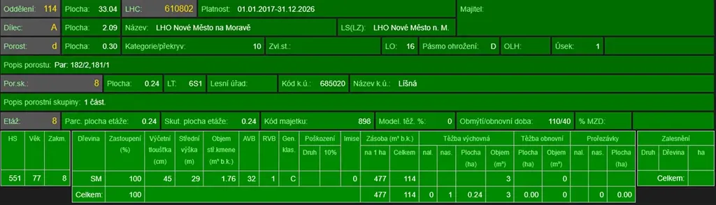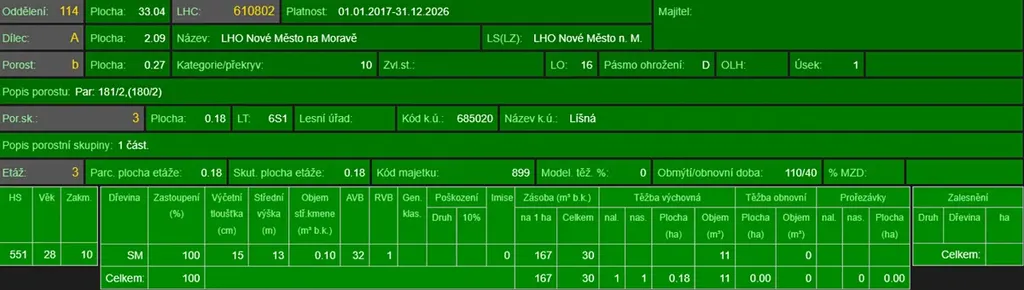 - p.č. 181/3 vedená jako lesní pozemek o celkové výměře 781 m2 (stáří lesa 35 let - zastoupení dřevin smrk),