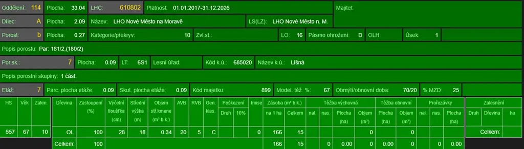 - p.č. 180/2 vedená jako lesní pozemek o celkové výměře 1 331 m2 (stáří lesa 76 let - zastoupení dřevin olše, stáří lesa 37 let - zastoupení dřevin smrk),