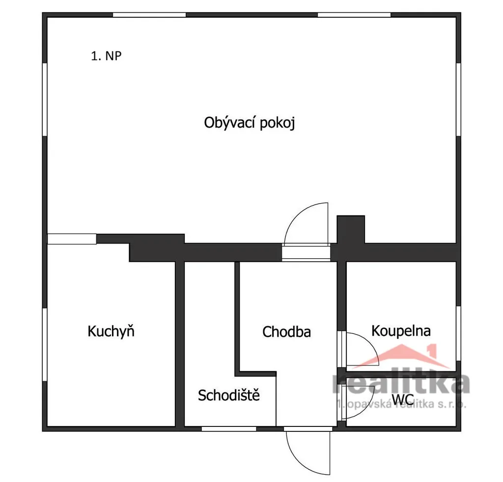 V přízemí se nachází vstupní předsíň, prostorný obývací pokoj, kuchyň, koupelna se sprchovým koutem a samostatné WC.