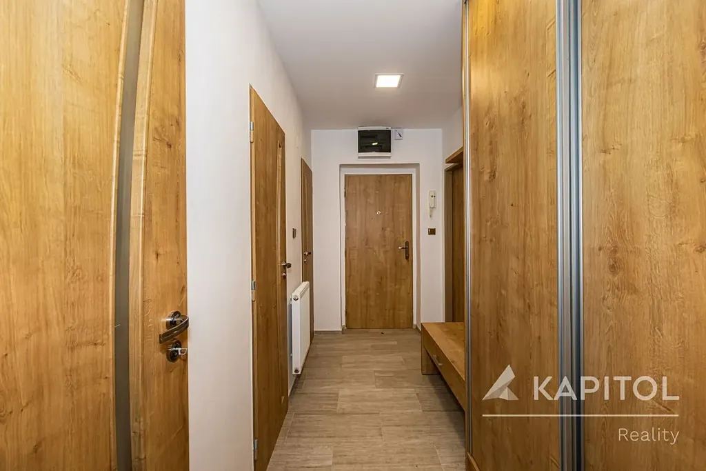 Dominantou bytu je krásná nová kuchyňská linka plně vybavená spotřebiči včetně myčky. V ložnici je nová postel a praktická vestavná skříň na míru, která nabízí dostatek úložného prostoru.