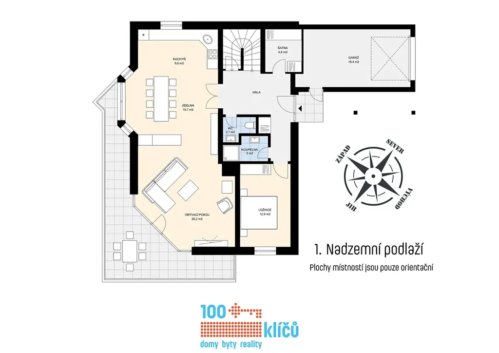 1. Nadzemní podlaží: Srdcem domu je prostorný obývací pokoj spojený s otevřenou kuchyní a jídelnou. Z tohoto prostoru je přímý vstup na rozlehlou terasu, která je ideálním místem pro letní obědy nebo večerní grilování s výhledem na západ slunce. Na tomto podlaží se dále nachází ložnice, koupelna, oddělená toaleta, šatna a hala. Součástí přízemí je také prostorná garáž.