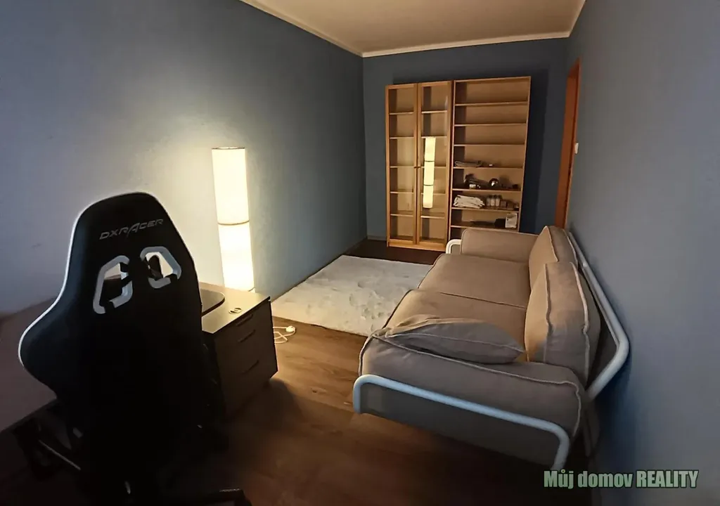 * **Pracovna / druhý pokoj:** gauč, pracovní stůl, kancelářská židle, knihovna, skříň