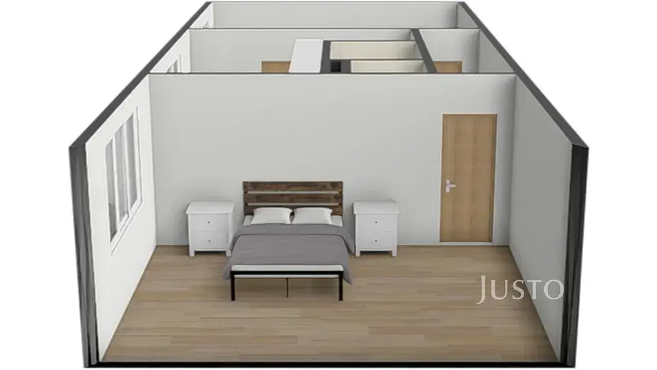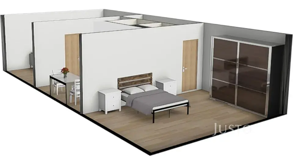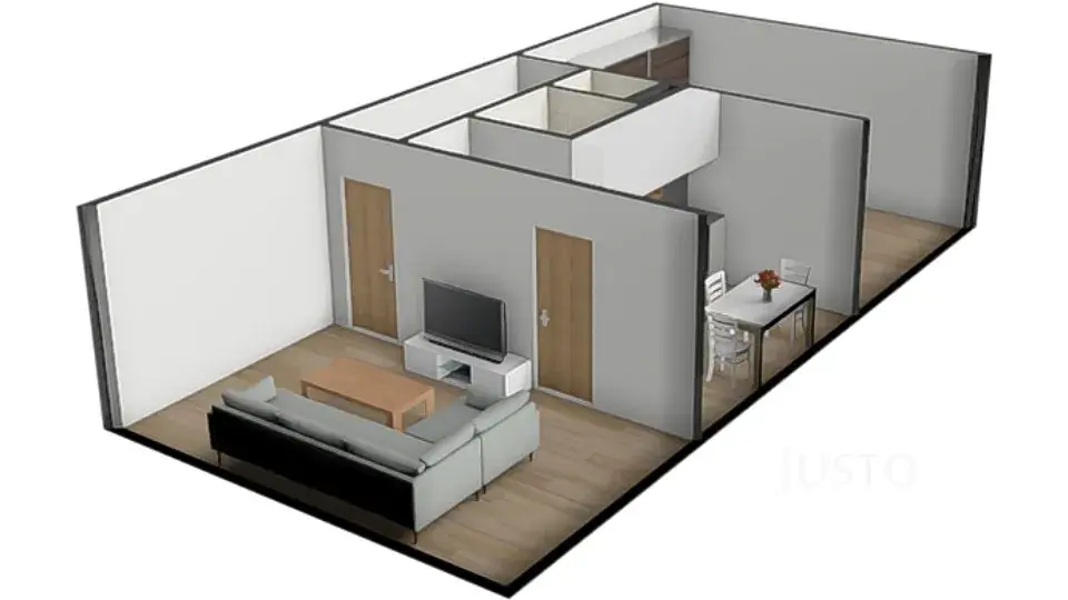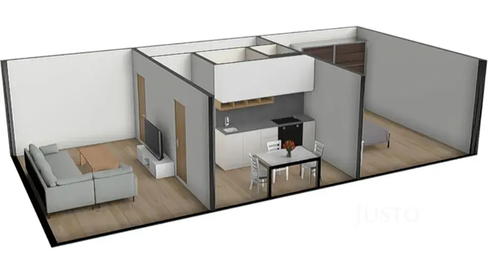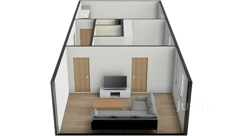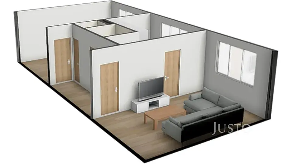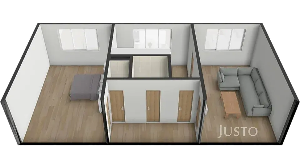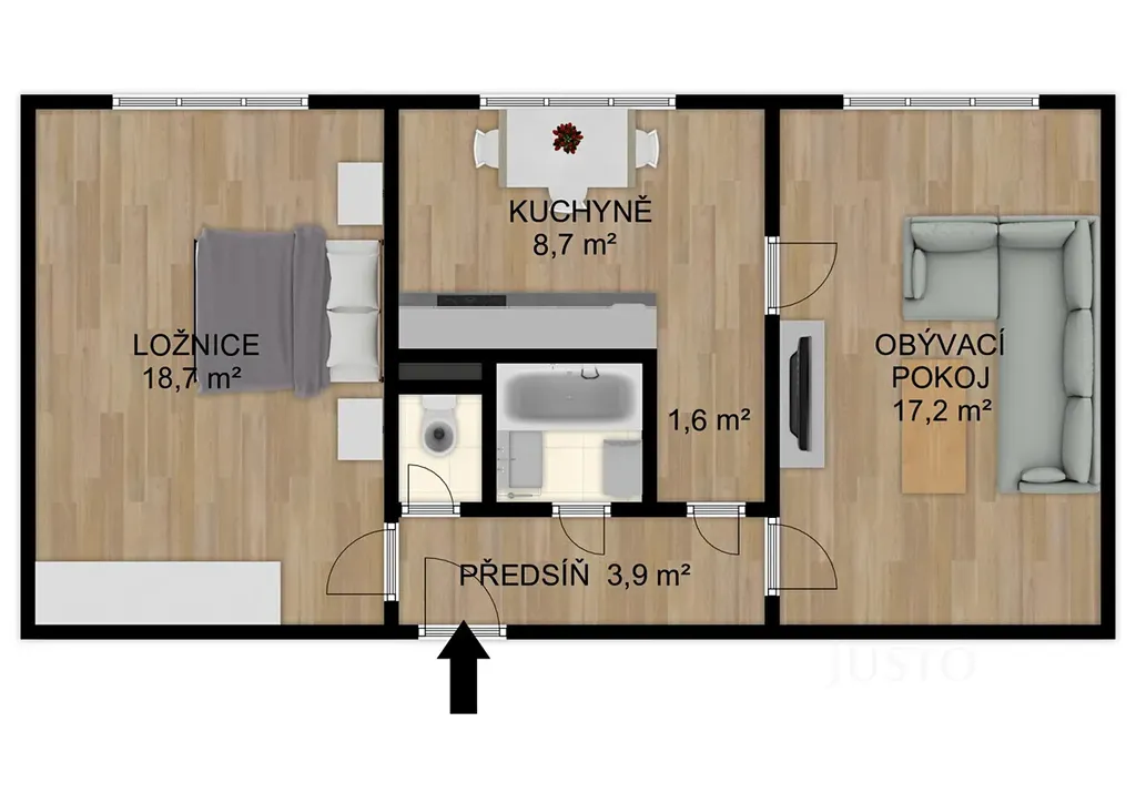 Celková plocha bytu je 51 m², plus sklep 2 m². Obě místnosti jsou s vlastním vstupem. Obývací pokoj má pak ještě dveře přímo do kuchyně ( v současné době tento vstup není využíván).