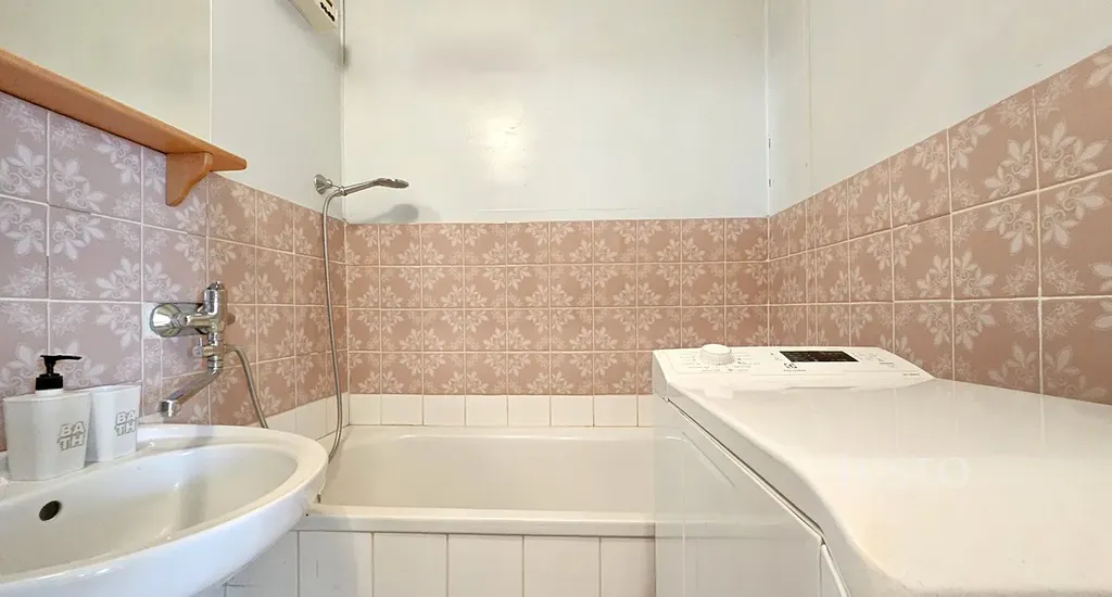 Umakartové jádro, obloženo keramickým obkladem. Koupelna je s vanou, místem pro pračku, toaleta je zvlášť.