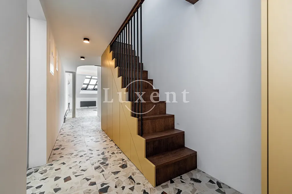 Obývací pokoj je otevřený až do hřebene střechy (4,6 m), má atypický tvar a je ozvláštněn masivním původním komínem, který podtrhuje originalitu celého bytu. Je zde příprava pro kuchyň s ostrůvkem, kombinovaná podlaha (dlažba, dřevo), prostor pro jídelnu a obývací část. V ložnici je pak vestavěná skříň a en-suite koupelna s prosklením, vanou, toaletou a individuálně vyrobeným kruhovým umyvadlem se skříňkou. Druhá koupelna u vchodu do bytu je vybavena sprchou, toaletou a má okno do světlíku. Z chodby vedou schody do horní úrovně bytu na prosvětlenou galerii s průhledem do obývacího pokoje. Pod schody je skříň pro uložení věcí a zázemí pro pračku. K bytu náleží sklep (8 m2).