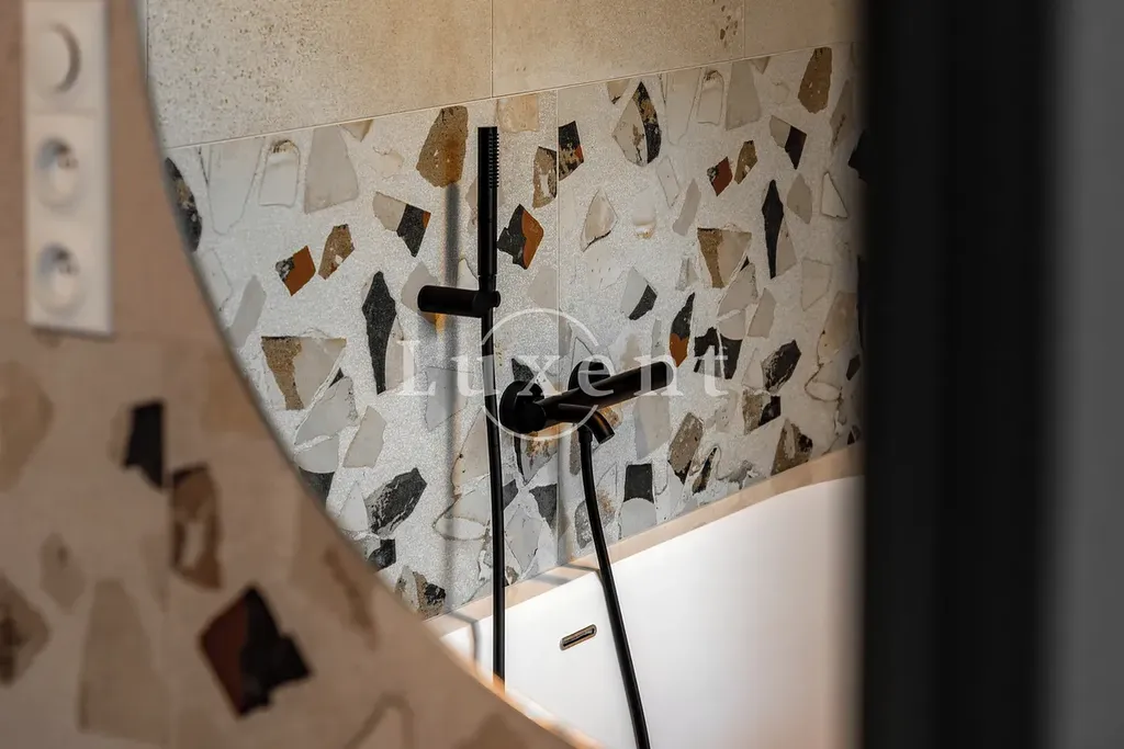 V koupelně a na chodbě je položena originální velkoformátová designová dlažba inspirovaná původním terazzem Cocci Calce Spaccato 900 × 900.