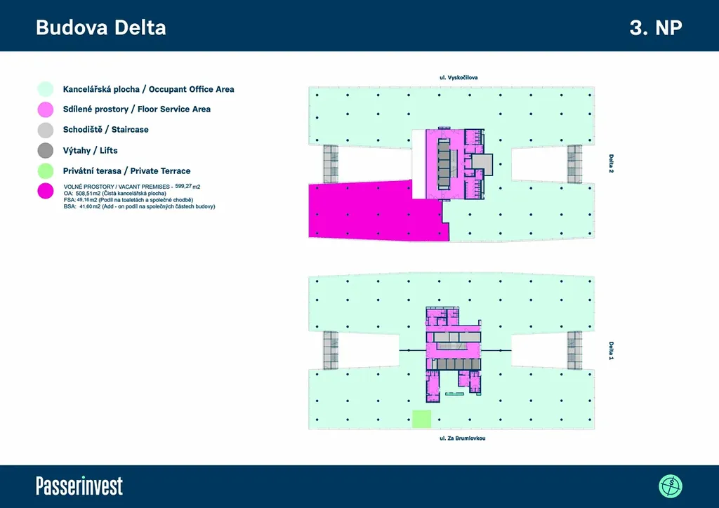 Nabízíme na pronájem prvotřídní kancelářské prostory o celkové ploše 599 m2 ve 4. nadzemním podlaží administrativní budovy Delta, Vyskočilova 1561/4a, Praha 4 – Michle. Prostory ve standardu open plan jsou k dispozici ihned. Další prostory ihned k pronájmu v této budově ve stávajícím fit outu jsou v 7. NP (1 320 m2) a v 5. NP (2 030 m2). V květnu 2026 pak budou k dispozici ve stávajícím fit outu kanceláře o ploše 915 m2 ve 3. NP, úpravy jsou samozřejmě možné. Delta, která je součástí lokality Brumlovka, má celkovou pronajímatelnou plochu 40 800 m2 v 8 nadzemních podlažích a 880 parkovacích míst v 5 podzemních podlažích. Nachází se v místě ohraničeném hlavní třídou Vyskočilova a ulicemi Václava Sedláčka a Za Brumlovkou. Deltu tvoří dvě samostatné budovy s velmi efektivním půdorysem ve tvaru dvou písmen H. Delta je navržena s maximálním ohledem na životní prostředí, k dispozici nájemcům jsou prostorné střešní terasy s bohatou zelení a relaxačními zónami. Západní část budovy lemuje zelený pás s umělým říčním korytem, na jižní stranu objektu volně navazuje Park Brumlovka. V přízemí budovy je restaurace a veřejná kantýna. Delta má vynikající dopravní dostupnost: autobusová zastávka přímo před budovou (dvě zastávky ke stanicím linky trasy C – Budějovická a Kačerov), přímé napojení na Pražský okruh a dálnici D1. Široká nabídka obchodů a služeb v lokalitě Brumlovky (restaurace, kavárny, veřejné kantýny, supermarket Albert, drogerie, zdravotnická zařízení, fitness a wellnes Balance Club Brumlovka, čistírna…), parky pro odpočinek a relaxaci a Náměstí Brumlovka s vodními prvky a posezením, kde se konají pravidelně trhy a společenské a kulturní akce. K hlavním nájemcům budovy Delta patří společnosti Hewlett Packard, HP INc. a Microsoft.