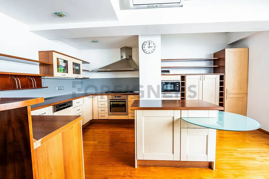 Byt se skládá z několika prostorných a světlých místností s vestavěnými úložnými skříněmi. Ložnice (13,89 m²), pokoj (8,7 m²), oddělená kuchyň (45,73 m²) a obývací část (51,56 m²) propojují eleganci s praktičností. Kuchyně i obývací pokoj mají přímý vstup na zimní terasu i balkon (8,38 m²).