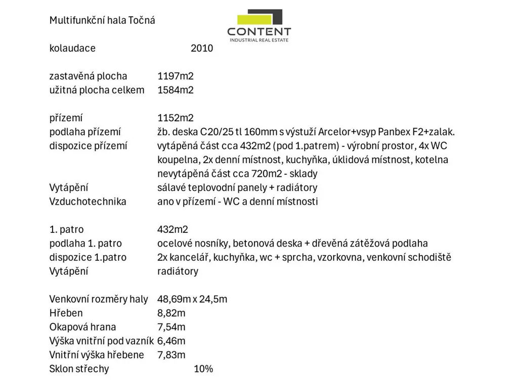 - vytápěná hala se zastavěnou plochou 1 200 m² (čistá výška 6,5 m), užitná plocha 1 584 m²,