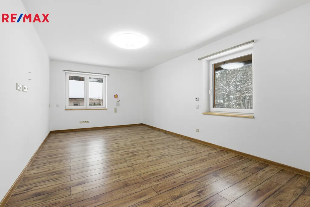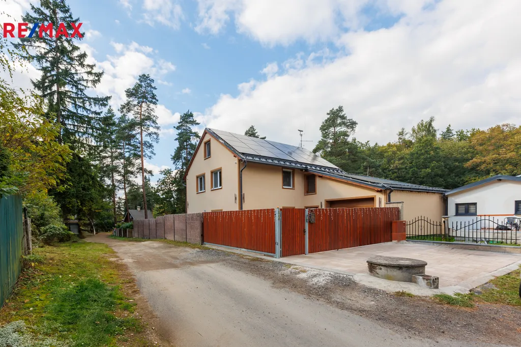 Ve druhém patře jsou umístěny ložnice a další koupelna s WC. Masivní schodiště a precizně zpracované detaily vytvářejí útulnou, ale zároveň reprezentativní atmosféru. Nad garáží se nachází prostorná půda o velikosti cca 40 m² a další půdní prostor nad domem o rozloze přibližně 80 m², do kterého je již přivedeno topení – ideální možnost pro vybudování dalších obytných místností. Dům je vybaven moderními technologiemi – kamerovým systémem kolem celého objektu napojeným na bezpečnostní službu Jablotron, videotelefonem s možností vzdáleného přístupu a elektronickými venkovními roletami, které zajišťují stínění, vyšší bezpečnost i lepší tepelnou izolaci. Tyto prvky zároveň přispívají ke snížení energetické náročnosti domu. Vytápění domu je řešeno podlahovým topením napojeným na tepelné čerpadlo. Na střeše jsou instalovány solární panely o výkonu 34 kW. Odpad je řešen vlastní čističkou odpadních vod. Zásobování vodou je zajištěno třemi zdroji: vrtanou studnou na pozemku (využívanou k zalévání), studnou před domem pro splachování WC a podzemní nádrží o objemu 12 m³ na pitnou vodu.