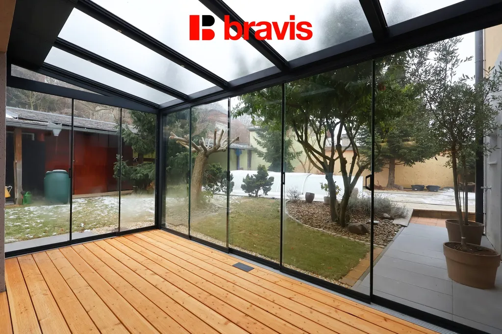 Částečně zařízený byt má plochu 106,4 m² + zimní zahrada s výhledem zahrady s okrasnými dřevinami.