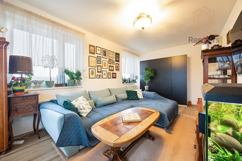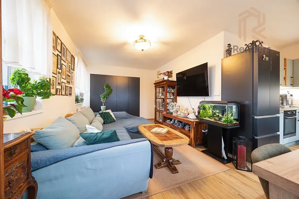 Byt nabízí příjemný obytný prostor s kuchyňským koutem, samostatnou ložnici, koupelnu a vstupní chodbu s dostatkem místa pro úložné prostory. Z obývací části je vstup na balkon o velikosti 4,2 m², ideální pro ranní kávu, odpočinek nebo menší posezení. Pro dokonalý komfort byly na všech oknech nainstalovány předokenní elektrické rolety.