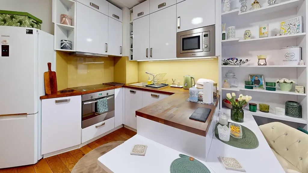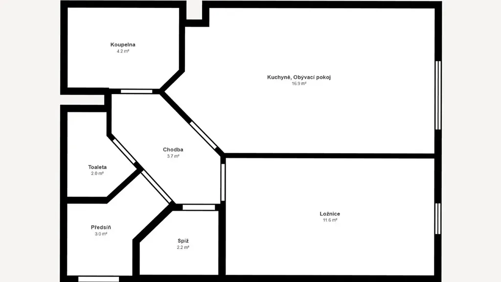 Dispozice bytu nabízí ložnici, obývací pokoj s kuchyňským koutem a vstupem na balkon, dále komoru (šatnu), předsíň a samostatnou koupelnu s toaletou. Byt je vybaven ve vyšším standardu – kvalitními dveřmi, moderní kuchyňskou linkou s velkým množstvím úložného prostoru a vestavěnými skříněmi na míru.
