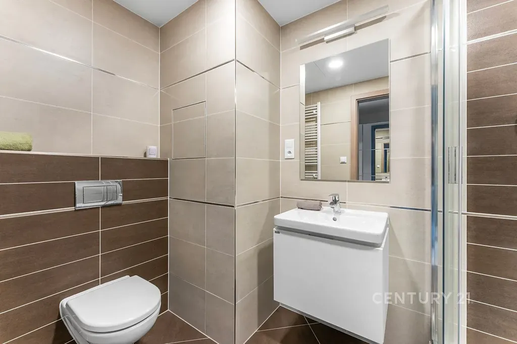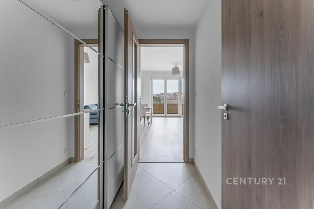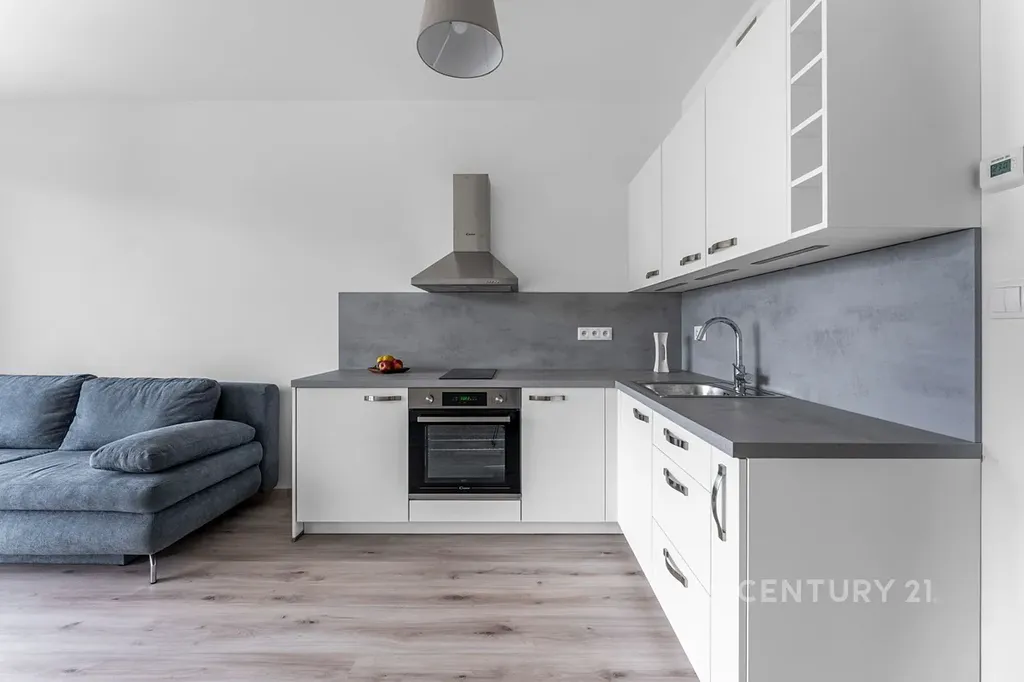 Interiér bytu je částečně zařízen a nabízí moderní vybavení včetně vestavěné lednice s mrazákem, elektrické varné desky, vestavěné elektrické trouby a digestoře. Dále je k dispozici nový praktický rozkládací gauč, skříň, stůl, a závěsy včetně záclon.