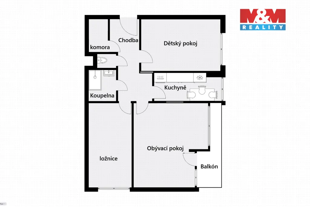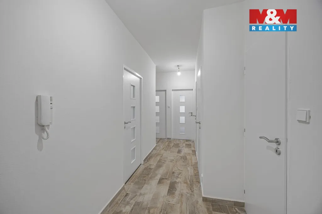 Dispozice bytu nabízí tři neprůchozí pokoje (obývací pokoj, dětský pokoj a ložnici). Z obývacího pokoje je vstup na prostorný balkón. Byt má samostatné WC a koupelnu po rekonstrukci se sprchovým koutem. V bytě se nachází také komora, která je vhodná na umístění pračky a sušičky. V suterénu domu se nachází prostorný zděný sklep a společná kolárna.