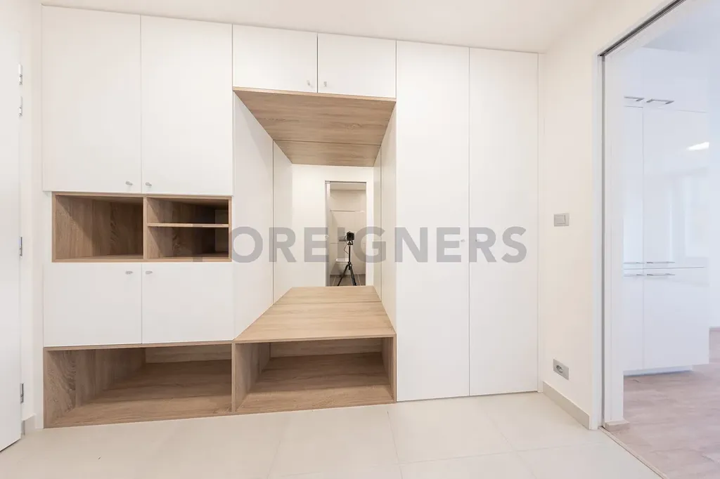 Vstupní chodba: vybavená od stropu po podlahu úložnými prostory, botníkem a zrcadlem. Domácí telefon + kamera od hlavního vchodu do budovy.