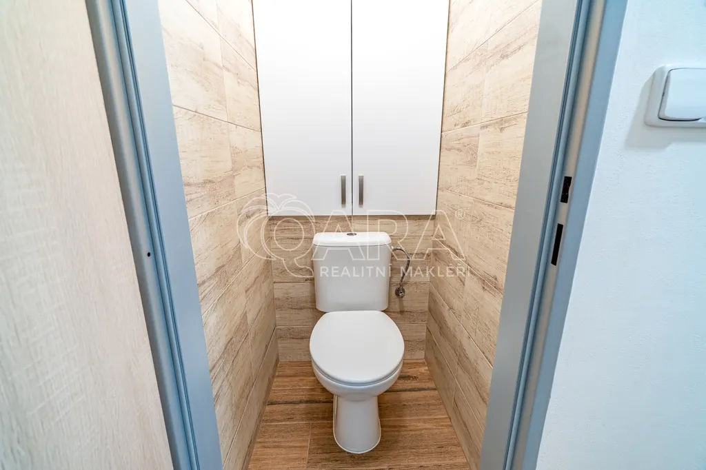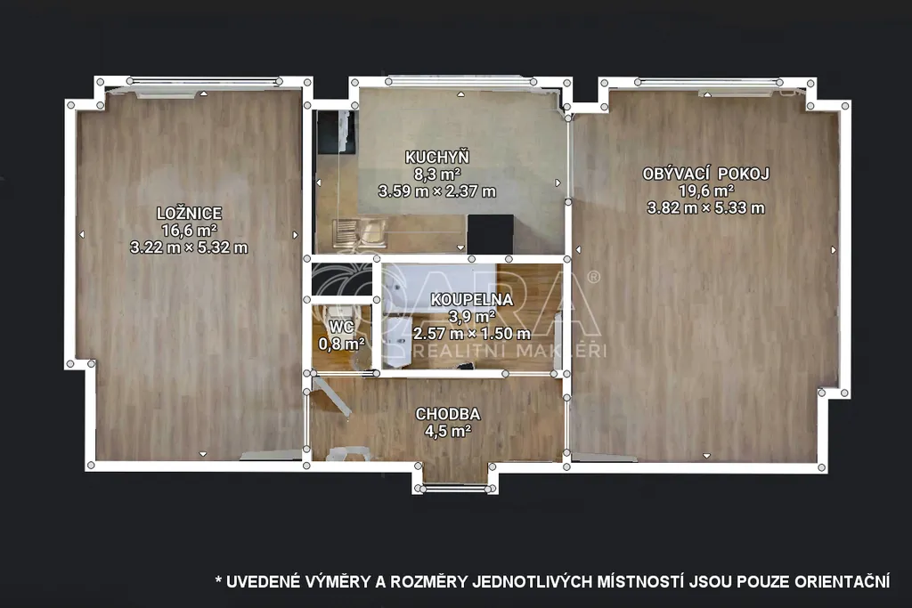 Dispozici bytu tvoří vstupní chodba, obývací pokoj, kuchyň, ložnice, koupelna s vanou a samostatná toaleta.