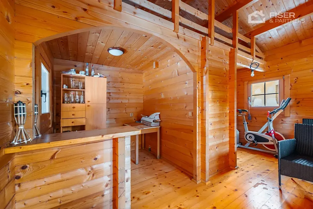 Interiér domu je logicky rozdělen tak, aby poskytoval dostatek soukromí všem členům domácnosti. Přízemí i patro nabízejí plnohodnotné dispozice, které lze využívat nezávisle na sobě. Srdcem pozemku o rozloze 800 m2 je kromě samotného domu také stylový zahradní domek, který není jen obyčejným skladem nářadí. Je vybaven vlastním barem a prostorem pro spaní, což z něj dělá ideální místo pro letní večery s přáteli nebo zázemí pro hosty. Parkování je vyřešeno prostornou garáží přímo v domě a dalšími parkovacími místy na vlastním pozemku před vstupem.