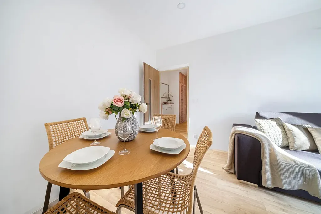 Byt je plně vybavený, světlý, dobře dispozičně řešený a vhodný i pro spolubydlení, protože kuchyň odděluje obývací pokoj a ložnici.