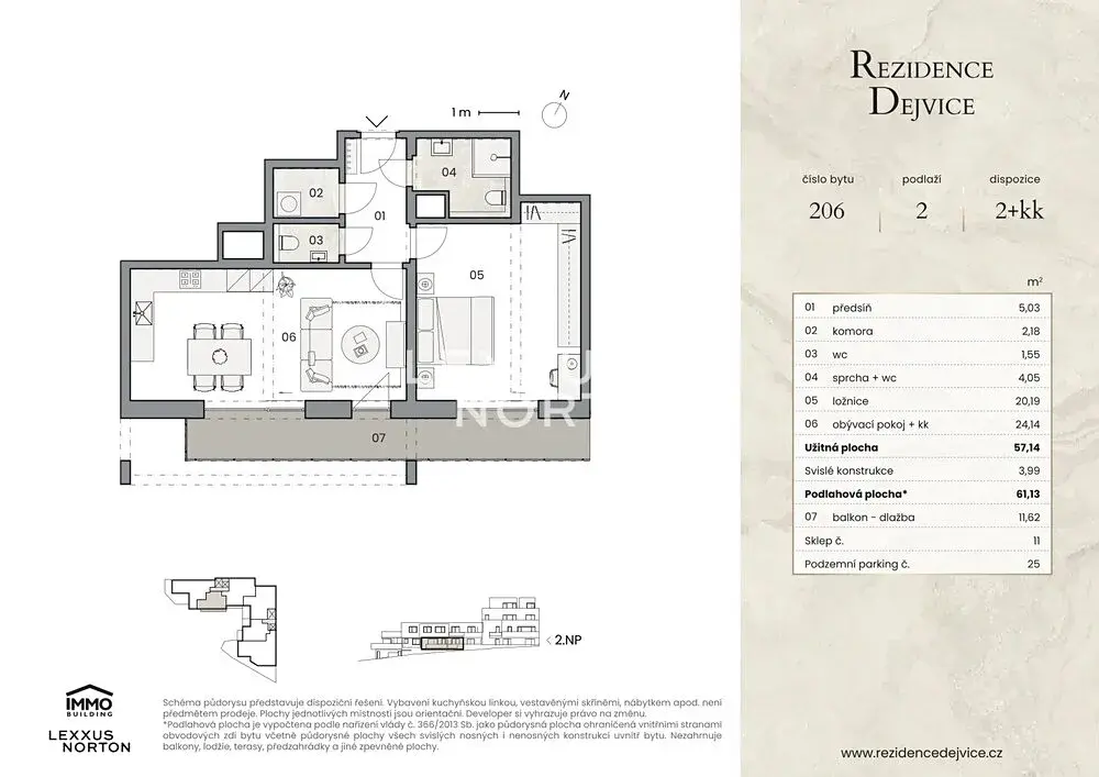 Nabízíme k prodeji jedinečný byt 2+kk o užitné ploše 57,14 m² v luxusním rezidenčním projektu na pomezí Ořechovky a Starých Dejvic. Součástí bytu je prostorný balkon o velikosti 11,62 m². Tento venkovní prostor poskytuje ideální zázemí pro relaxaci, posezení s přáteli i každodenní kontakt s přírodou v naprostém soukromí.