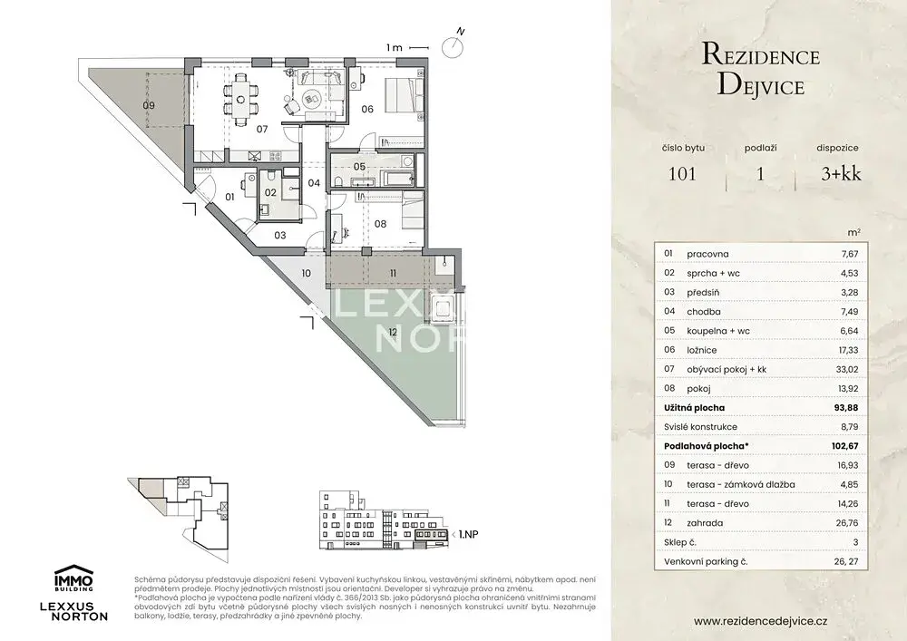 K prodeji nabízíme exkluzivní byt 3+kk v moderním projektu Rezidence Dejvice, který propojuje nadčasový design, vysoký standard vybavení a výjimečnou lokalitu v jedné z nejžádanějších částí Prahy. Byt disponuje užitnou plochou 93,88 m² a jeho hlavní dominantou je prostorný obývací pokoj s kuchyňským koutem a vstupem na terasu o výměře 38 m² a vlastní zahrádku o výměře 26,76 m².