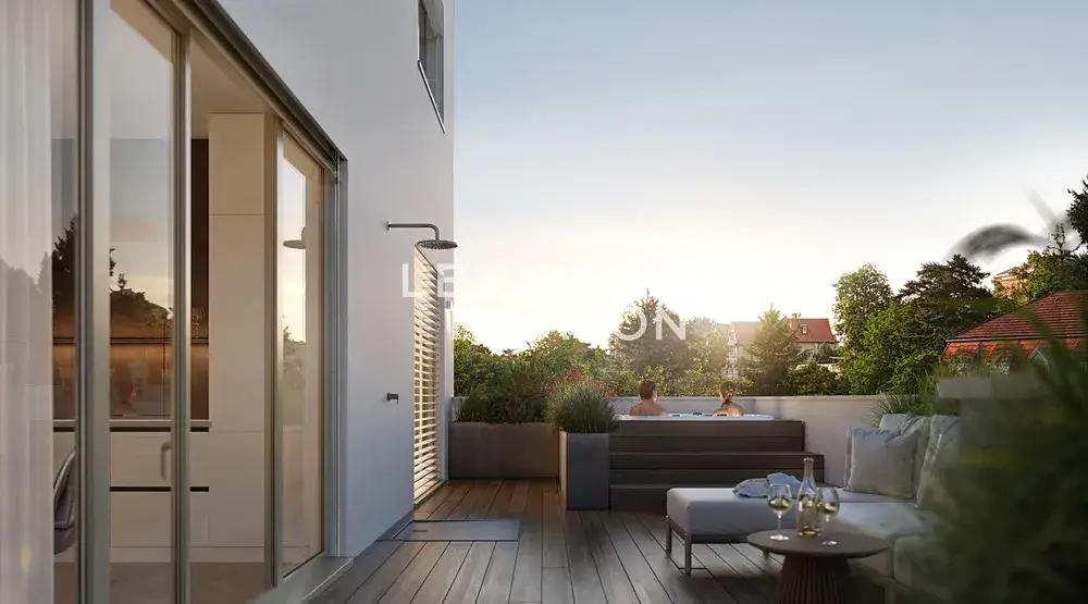 Praktické příslušenství představuje sklepní prostor a dvě garážová stání. Přímý vstup na terasu orientovanou do klidného vnitrobloku zaručuje příjemné soukromí a kontakt s městskou zelení.