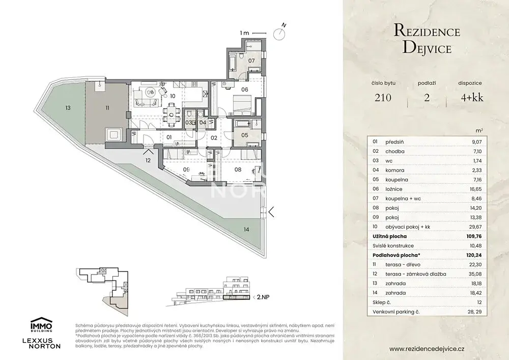 Nabízíme k prodeji prostorný byt 4+kk v rezidenčním projektu Rezidence Dejvice, který vyniká velkorysou podlahovou plochou 120,24 m² a exkluzivní terasou a privátní zahradou, díky kterým je propojení s okolní zelení každodenní realitou. Dispozice 4+kk nabízí maximální komfort a dostatek prostoru pro rodinu i jednotlivce, kteří hledají výjimečné bydlení v prestižní lokalitě.