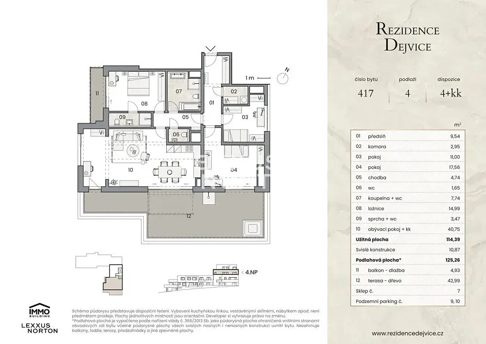 Nabízíme k prodeji prostorný byt 4+kk v rezidenčním projektu Rezidence Dejvice, který vyniká velkorysou podlahovou plochou 125,26 m² a exkluzivní terasou a balkonem, díky kterým je propojení s okolní zelení každodenní realitou. Dispozice 4+kk nabízí maximální komfort a dostatek prostoru pro rodinu i jednotlivce, kteří hledají výjimečné bydlení v prestižní lokalitě.