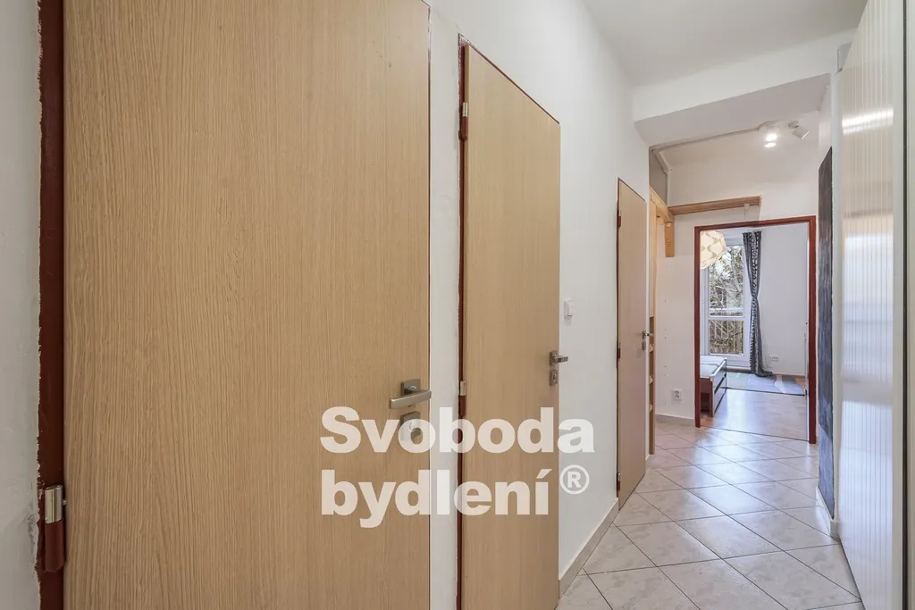 Vstupní dveře bytu vedou do předsíně tvaru L (cca 10m2). V pravé části nalezneme vstup do pokoje (cca 14m2) s balkonem, v čele předsíně další pokoj (cca 18,2), jenž je propojen také s obývacím prostorem. V levé části předsíně se nachází komora s pračkou, koupelna, samostatná toaleta a čelo předsíně uzavírají posuvné dveře do kuchyně (cca 8m2), na níž navazuje obývací prostor (cca 19m2). (Přiložený plánek je pouze orientační, určený k náhledu rozmístění místností).