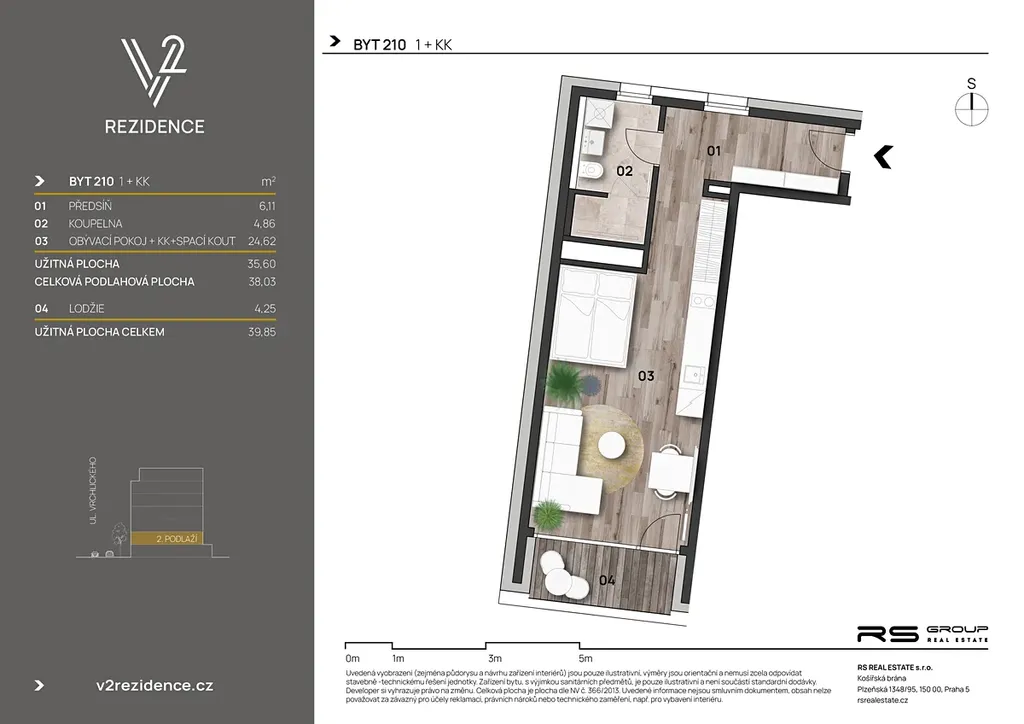 Nabízený byt o dispozici 1+kk a velikosti 38 m² je ve 2. patře a jeho součástí je lodžie o velikosti 4,25 m². K bytu je možné dokoupit sklepní kóji a parkovací stání (cena není zahrnuta do ceny inzerátu).