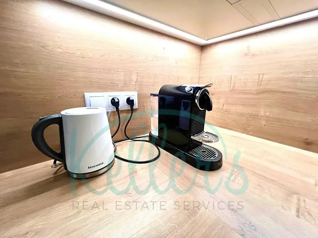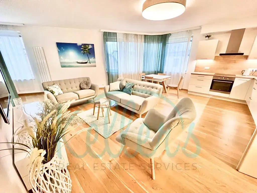 Středobod bytu tvoří obývací pokoj s kuchyňským koutem a vstupem na terasu. Ta je zastřešená a díky tomu může i v deštivých dnech sloužit jako příjemné místo pro posezení. Jednotka dále sestává ze dvou neprůchozích ložnic, z nichž jedna má vstup na balkon. Koupelna je společná s toaletou a je vybavena sprchovým koutem, k dispozici je také druhé samostatné WC. V předsíni je velká vestavěná skříň a vhod určitě přijde i technická místnost, kde je umístěna pračka a sušička značky Miele. Byt je nabízen plně zařízený nábytkem, spotřebiči a kompletním vybavením včetně nádobí, varné konvice, kávovaru, vysavače a televize. Zkrátka „ready to move in“, jen se nastěhovat.