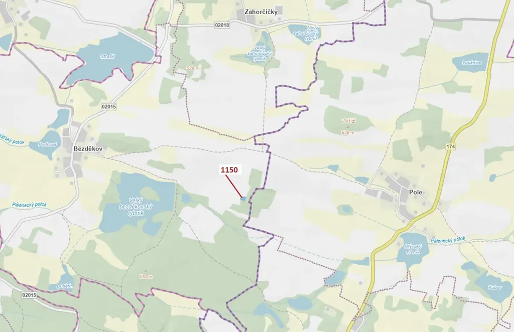 Lesní pozemek o výměře 1 116 m2, parcelní číslo 1150, podíl 1/1, katastrální území Bezděkov u Kasejovic, obec Hradiště, obec s rozšířenou působností Nepomuk, okres Plzeň-jih, Plzeňský kraj. Po těžbě.