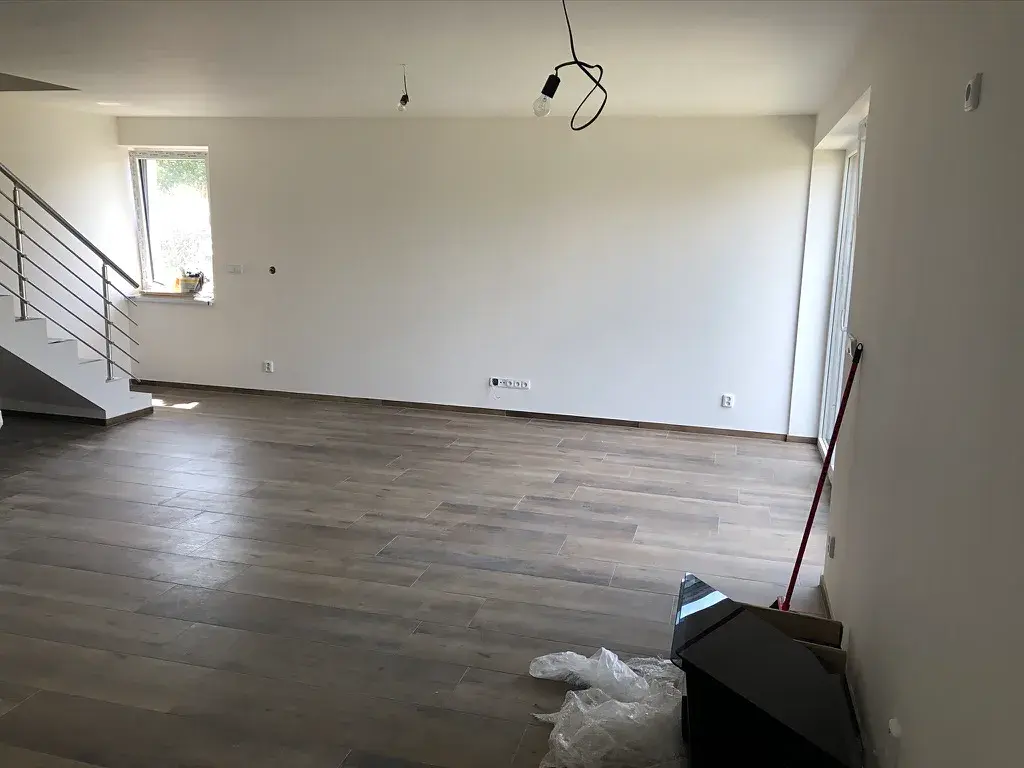 První patro – Obývací pokoj, kuchyně, zádveří, prostor pod schody, toaleta s umyvadlem a technickým prostorem.