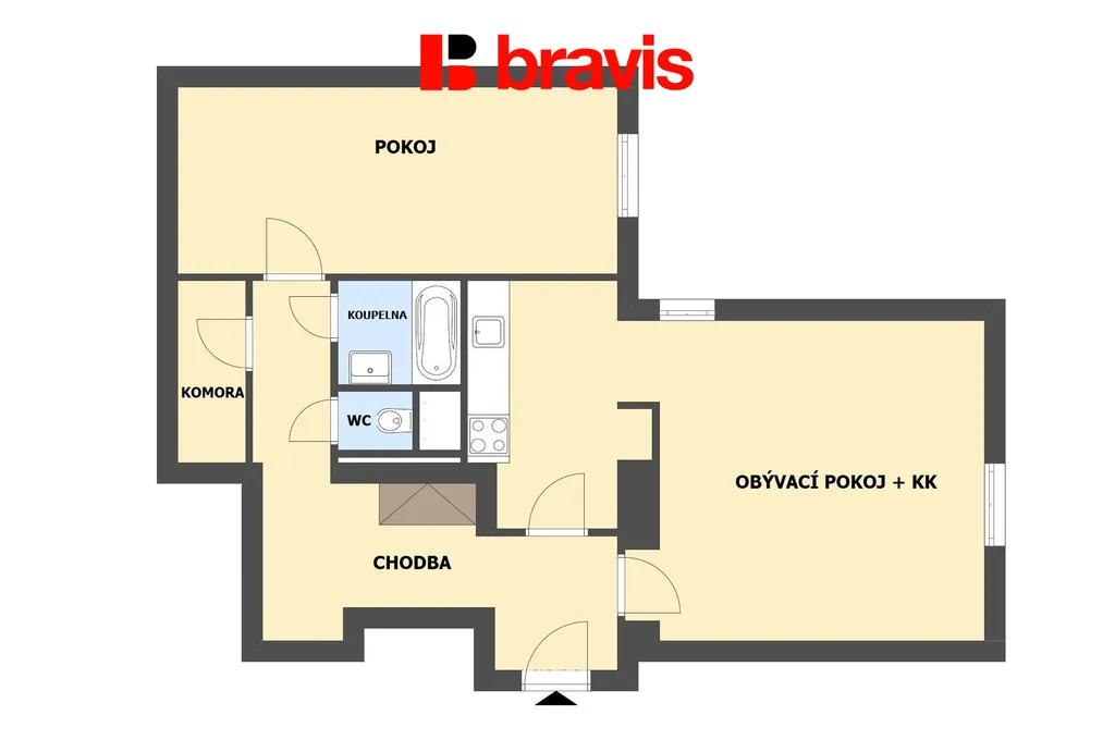 Byt se skládá z pokoje s kuchyňským koutem (kuchyně je vybavená kuchyňskou linkou s el. troubou, el. varnou deskou, odsavačem par, chladničkou s mrazákem), pokoje (s šatní skříní), koupelny (zařízené sprchovým koutem, umyvadlem, přípojkou na pračku), samostatnou toaletou a komory, která nabízí praktický úložný prostor pro vaše potřeby.