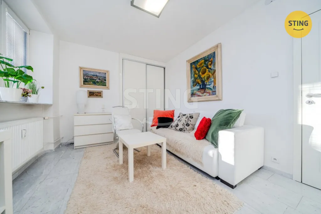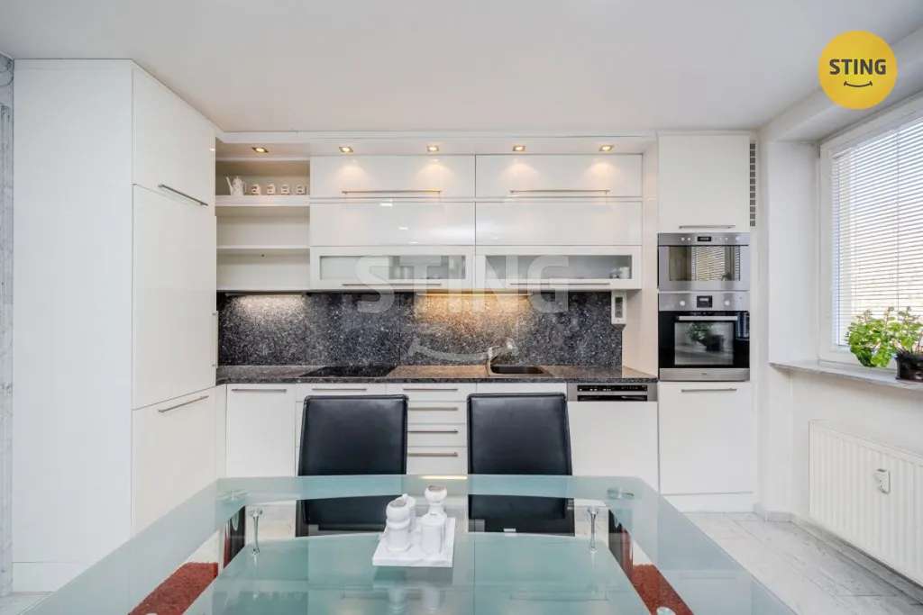 Byt prošel rozsáhlou rekonstrukcí. Obrovskou výhodou jsou neprůchozí pokoje. V prostorné chodbě je důmyslně uschovaná vestavěná skříň ve zdi za zrcadly a zároveň i komora se šatnou. Zrcadla krásně zvětší a podtrhnou vzdušný prostor. Chodbu a obývací pokoj s kuchyňským koutem dělí mohutné skleněné posuvné třídílné dveře, které příjemně doplní interiér jako designový prvek. Kuchyně s kuchyňskou linkou, pracovní deska z granitu, s vestavěnou lednicí a mrazákem, varnou deskou, elektrickou troubou, digestoří, mikrovlnou troubou, myčkou a pračkou. Koupelna s vanou, umyvadlem a umyvadlovou skříni se zrcadlem, obklady a dlažbou s WC dohromady. Mramor se nachází v celém bytě, jak na podlaze, obkladech, tak i na parapetech i jako designový prvek na stěně.
