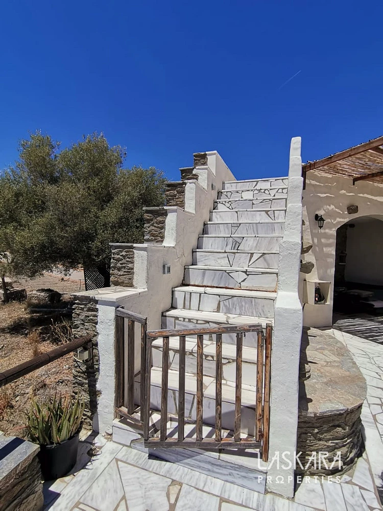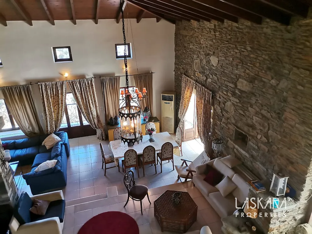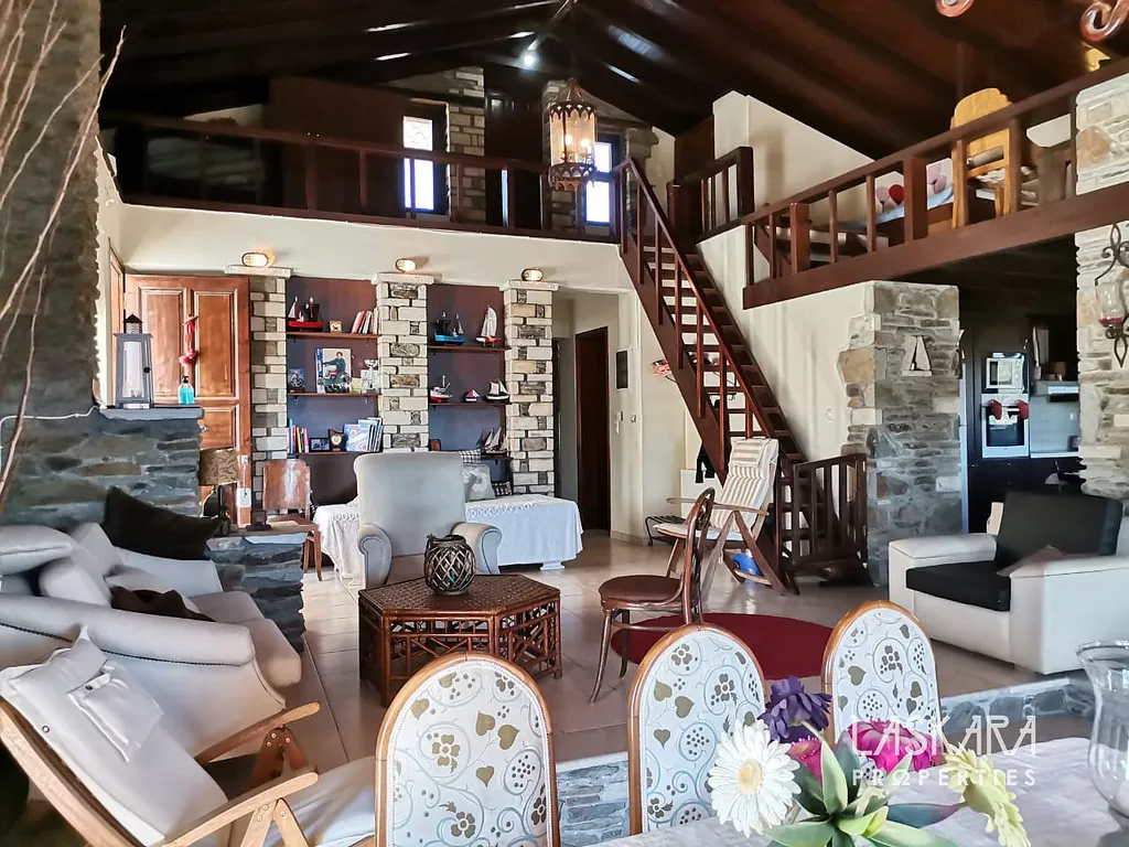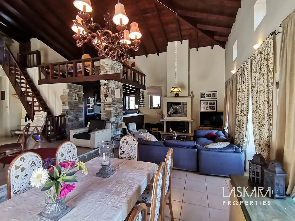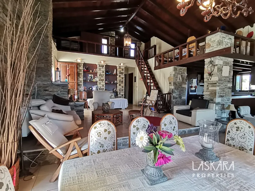Nemovitost o obytné ploše 410 m² nabízí tři podlaží s mnoha ložnicemi, několika koupelnami, dvěma obývacími pokoji, kuchyní a samostatným apartmánem pro hosty. V přízemí (154 m²) se nachází velkorysý společenský prostor s krbem a starožitným nábytkem, vhodný pro recepce, večeře nebo konference. Kamenné terasy s výhledem na moře, rozsáhlá zahrada a okolní příroda poskytují ideální prostředí pro nezapomenutelné události.