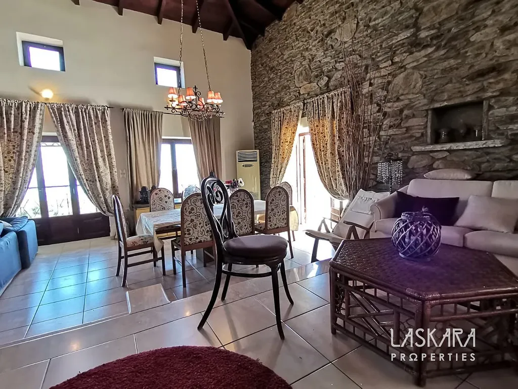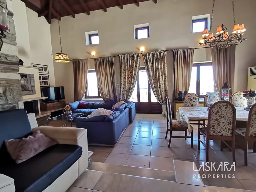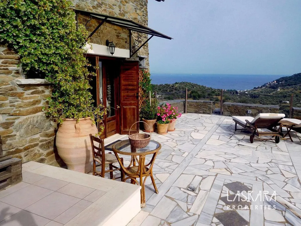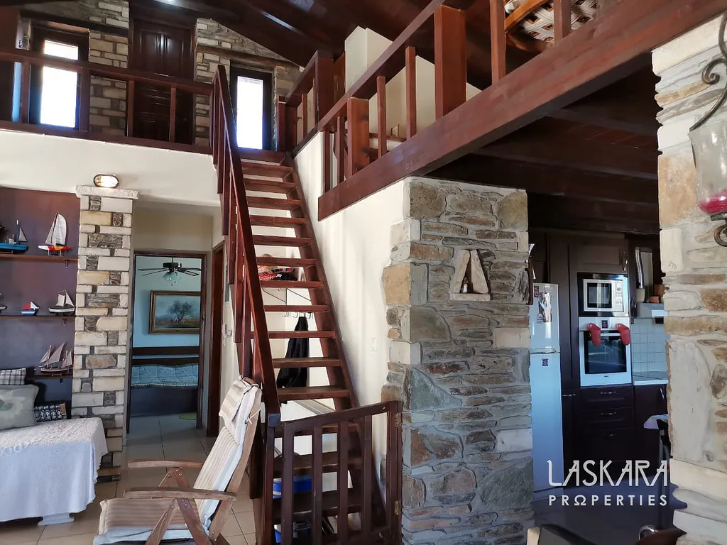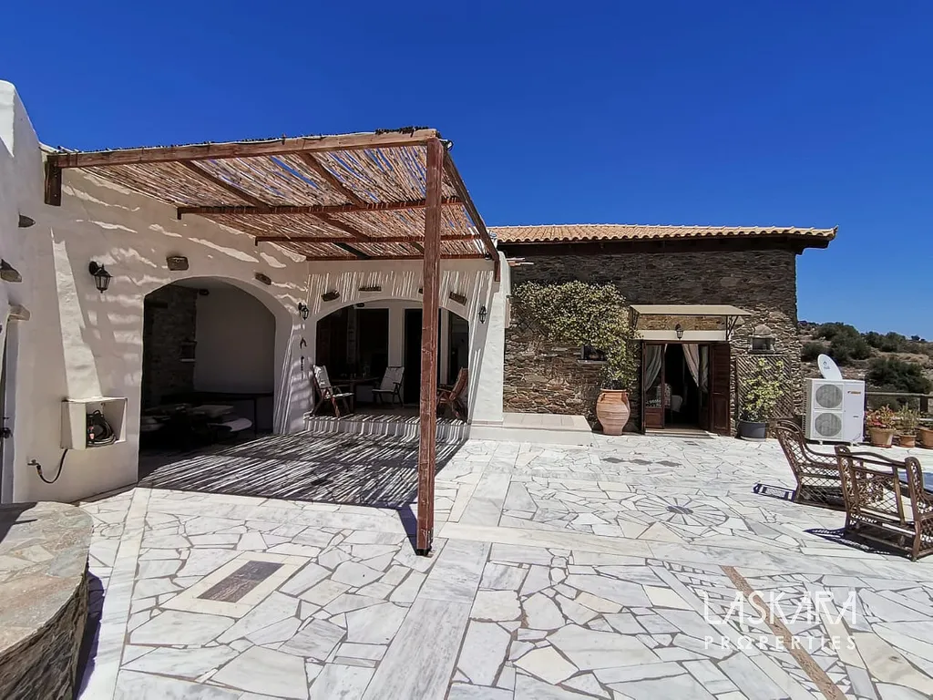Nemovitost o obytné ploše 410 m² nabízí tři podlaží s mnoha ložnicemi, několika koupelnami, dvěma obývacími pokoji, kuchyní a samostatným apartmánem pro hosty. V přízemí (154 m²) se nachází velkorysý společenský prostor s krbem a starožitným nábytkem, vhodný pro recepce, večeře nebo konference. Kamenné terasy s výhledem na moře, rozsáhlá zahrada a okolní příroda poskytují ideální prostředí pro nezapomenutelné události.