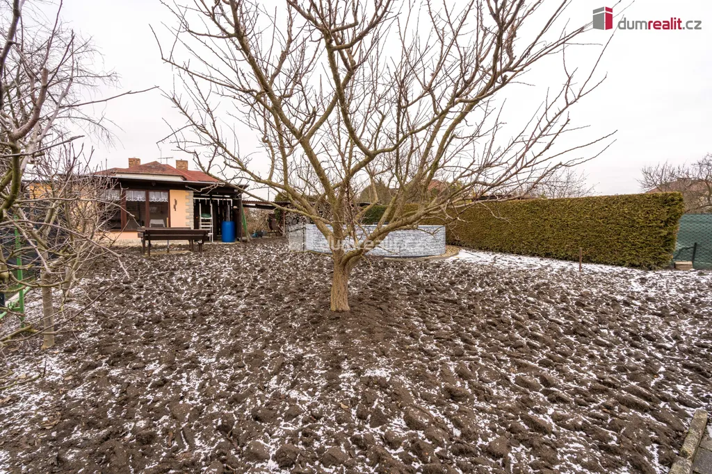Na zahradu se dostaneme po betonovém schodišti za domem. Zahrada o rozloze 267 m² je dostačující pro stávající nadzemní bazén, prostor pro pěstování, stromky i venkovní domek, který slouží jako letní kuchyňka.