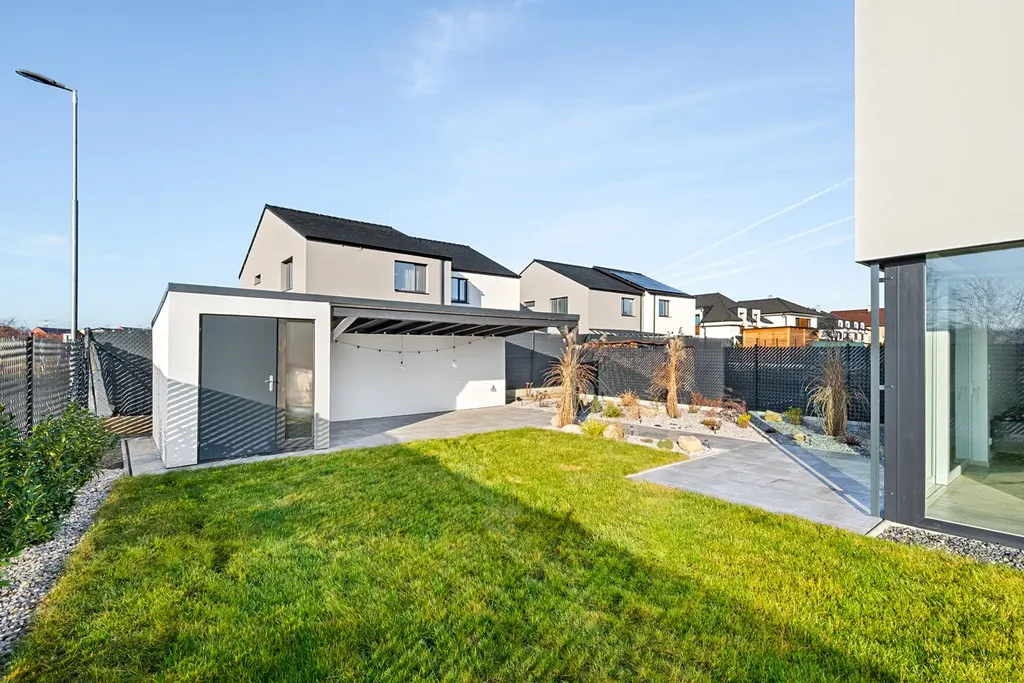 Zahradní posezení je zasazeno tak, aby splňovalo absolutní soukromí a navazuje na zděný zahradní sklad.