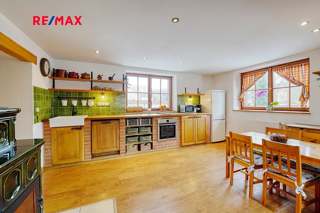 Dům o zastavěné ploše 158 m² a užitné ploše 96 m² nabízí komfortní bydlení s dispozicí 4+kk. Interiér prošel nedávnou rekonstrukcí a vytváří útulné a moderní prostředí pro rodinný život. Vytápění je zajištěno krbovými kamny s výměníkem a vyvložkovaným nerezovým komínem, na které efektivně rozvádí teplo do radiátorů po celém domě. Pro zvýšený komfort je v části domu instalováno podlahové vytápění. Ohřev vody probíhá kombinací elektrobojleru a krbových kamen, což poskytuje praktické a úsporné řešení pro každodenní potřebu teplé vody.