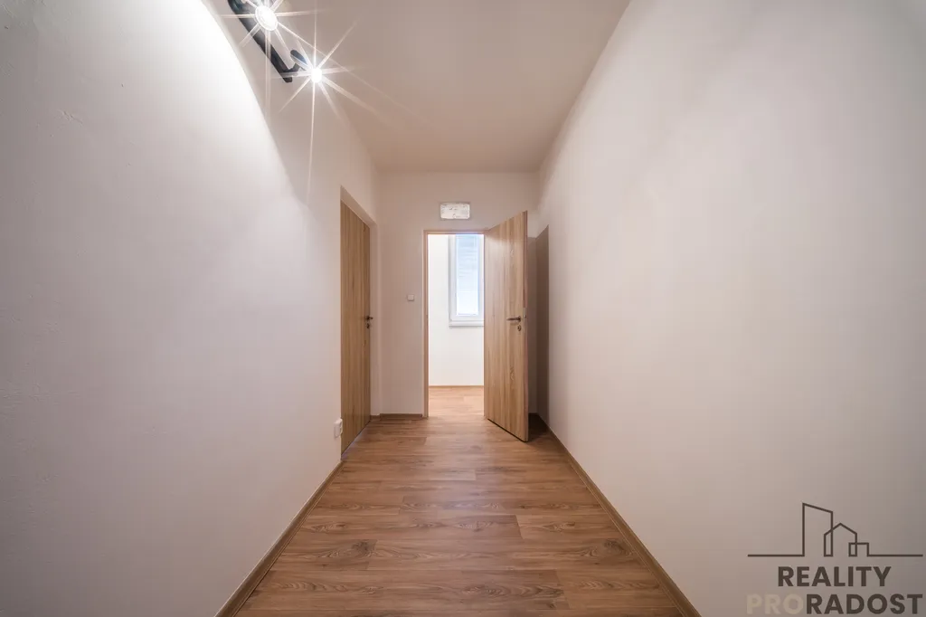 Byt se pyšní užitnou plochou cca 74 m² a balkonem o velikosti cca 6 m², což poskytuje dostatek prostoru pro pohodlné bydlení. Dispozičně je velmi dobře řešený, jelikož každý pokoj má vlastní vstup z centrální, prostorné vstupní chodby. Kromě toho byt disponuje dvěma šatnami a komorou, které nabízejí další úložný prostor pro vaše věci, nebo lze využít jako další pokoj – pracovnu. V přízemí bytového domu je taktéž úložný prostor.