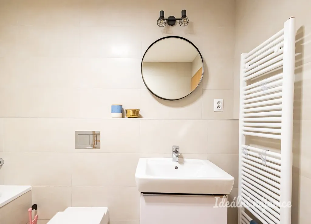 Byt se nabízí plně vybavený. Kuchyně disponuje lednicí, myčkou, elektrickou troubou, varnou deskou, a digestoří. Obývací část je zařízena pohovkou, konferenčním stolem, křeslem, televizí, 2 knihovnami a jídelním stolem se židlemi. Součástí ložnice je postel, komoda, vestavěná skříň a zrcadlo. V koupelně je vana, umyvadlo a WC. Druhé WC je umístěno samostatně. V předsíni najdeme vestavěnou šatní skříň.