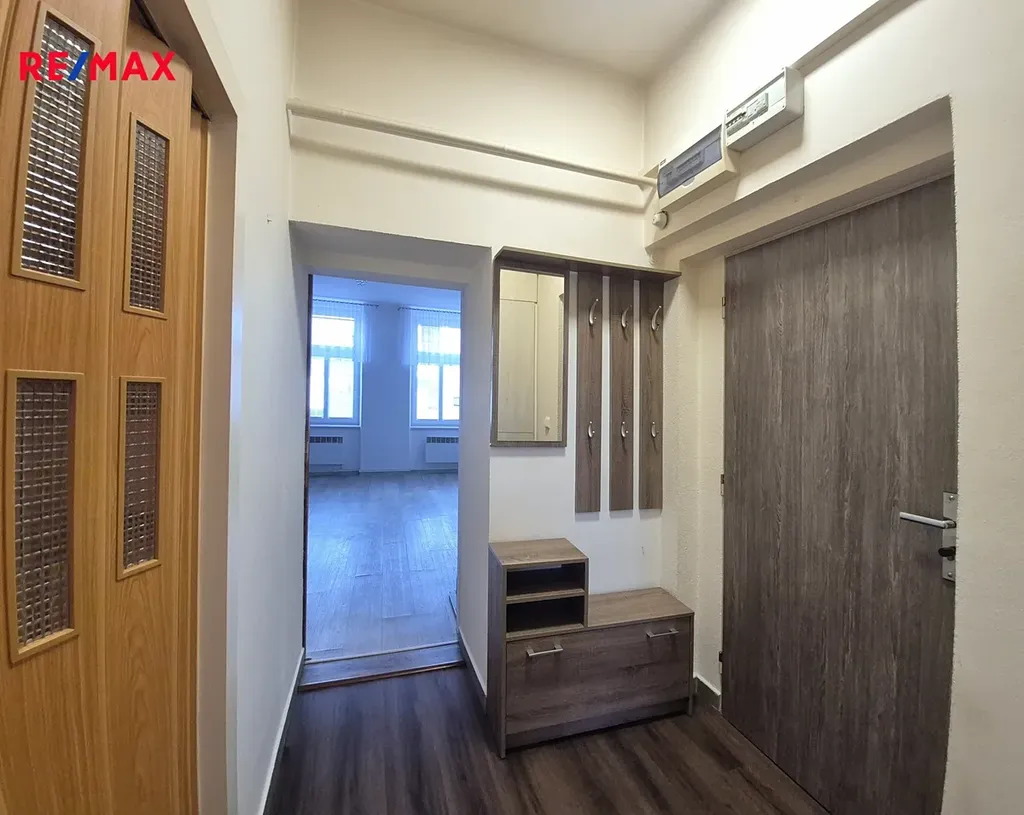 Byt je částečně vybavený, v ložnici je manželská postel s nočními stolky a šatní skříň, v předsíni botník s odkládací stěnou a skříň s úložným prostorem.