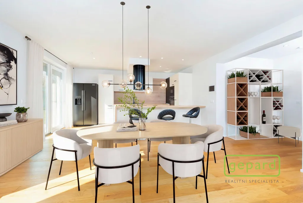 Dům vás přivítá světlým, vzdušným interiérem a promyšleným uspořádáním, které poskytuje dostatek prostoru pro společné chvíle i soukromí. Obývací část s výstupem na terasu propojuje vnitřní a venkovní život v jeden celek – ranní káva na terase, odpolední koupání s dětmi nebo večerní relax u bazénu se tu stanou přirozenou součástí každého dne.