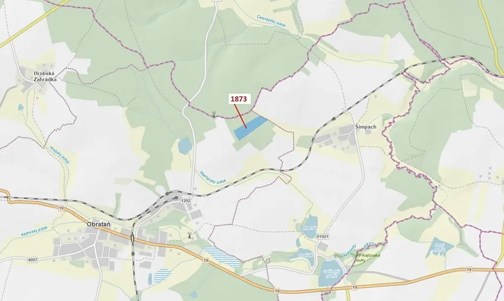 Lesní pozemek o výměře 32 740 m2, parcelní číslo 1873, podíl 1/1, katastrální území Obrataň, obec Obrataň, obec s rozšířenou působností Pacov, okres Pelhřimov, Kraj Vysočina. Po těžbě.