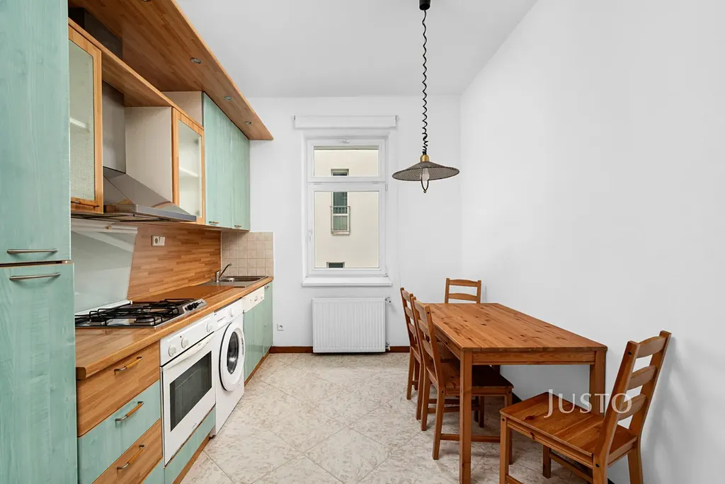 Byt je situován ve 3. nadzemním podlaží zrekonstruovaného cihlového domu. Dispozice bytu nabízí prostorný pokoj s částečným vybavením – k dispozici je pohodlná postel a dostatek prostoru pro další zařízení dle vašich představ. Kuchyně je vybavena moderní kuchyňskou linkou na míru, jídelním stolem, lednicí, mrazákem, myčkou, plynovou varnou deskou, troubou a nechybí ani pračka.