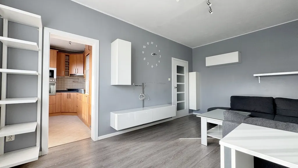 Obytné místnosti jsou světlé, orientované na jih a poskytují hezký výhled do okolní zeleně; přímo za domem je dětské hřiště. Byt se pronajímá kompletně vybavený. V ložnici se nachází manželská postel a velká vestavěná skříň, v předsíni další vestavěná skříň. Obývací pokoj je zařízen sedací soupravou, konferenčním stolkem, PC stolem a úložnými skříňkami. Kuchyně je vybavena lednicí, vestavnou troubou, indukční varnou deskou, mikrovlnnou troubou, digestoří a kuchyňskou linkou na míru. Koupelna má vanu a pračku. WC je samostatné. Vstup do bytu zajišťují bezpečnostní dveře. Součástí bytu je sklepní kóje o rozloze 2 m2.